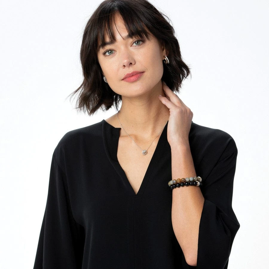 Neptune’s Rings gets a new twist with this stretch bracelet adorned with stacked rings. In natural black agate, it symbolizes peace and protection.