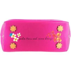 Our designer created a fantasy of orchids, angel’s trumpets, passion flowers, palm leaves and monstera leaves for this colorful and enchanting tote. On the bottom, a message reads, “palm trees and ocean breeze”
